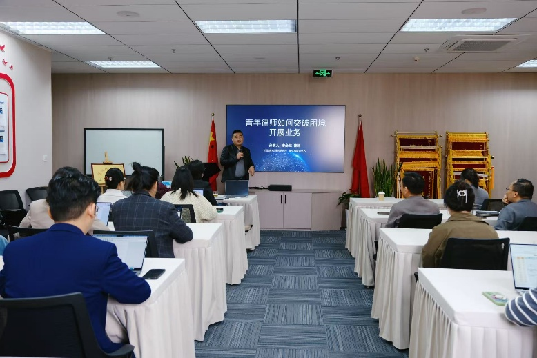 活动首个环节,特邀广东知恒(南京)律师事务所股权高级合伙人李全龙律师带来“青年律师如何突破困境开展业务”主题分享。李律师结合自身多年执业经历,以“实战者”的视角,为在场青年律师提供了极具指导性的发展思路。他提到,青年律师初期需重视案件量积累,通过处理各类案件夯实法律基础、提升实务能力;同时要保持对市场动态的敏感性,密切关注社会发展趋势下的业务需求变化——相较于偶发性诉讼案源,贴合社会发展方向的新兴业务更能为律师带来长期稳定的案源支撑,面对此类机会时需敢于尝试、主动突破,同时做好执业风险防控。此外,李律师特别强调青年律师需转变“传统法律思维”,不能仅局限于从法律角度解决问题,而应学会从客户需求出发,深入挖掘客户潜在的法律服务需求,拓展服务维度与深度,从而在竞争中形成差异化优势。