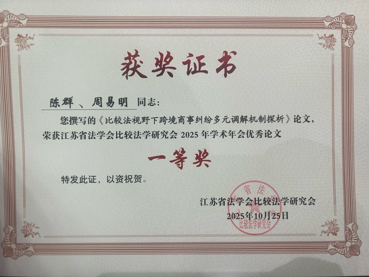 本所陈群律师、周易明律师受邀参加本次论坛,两位律师共同撰写的《比较法视野下跨境商事纠纷多元调解机制探析》一文荣获江苏省法学会比较法学研究会2025年学术年会优秀论文一等奖。