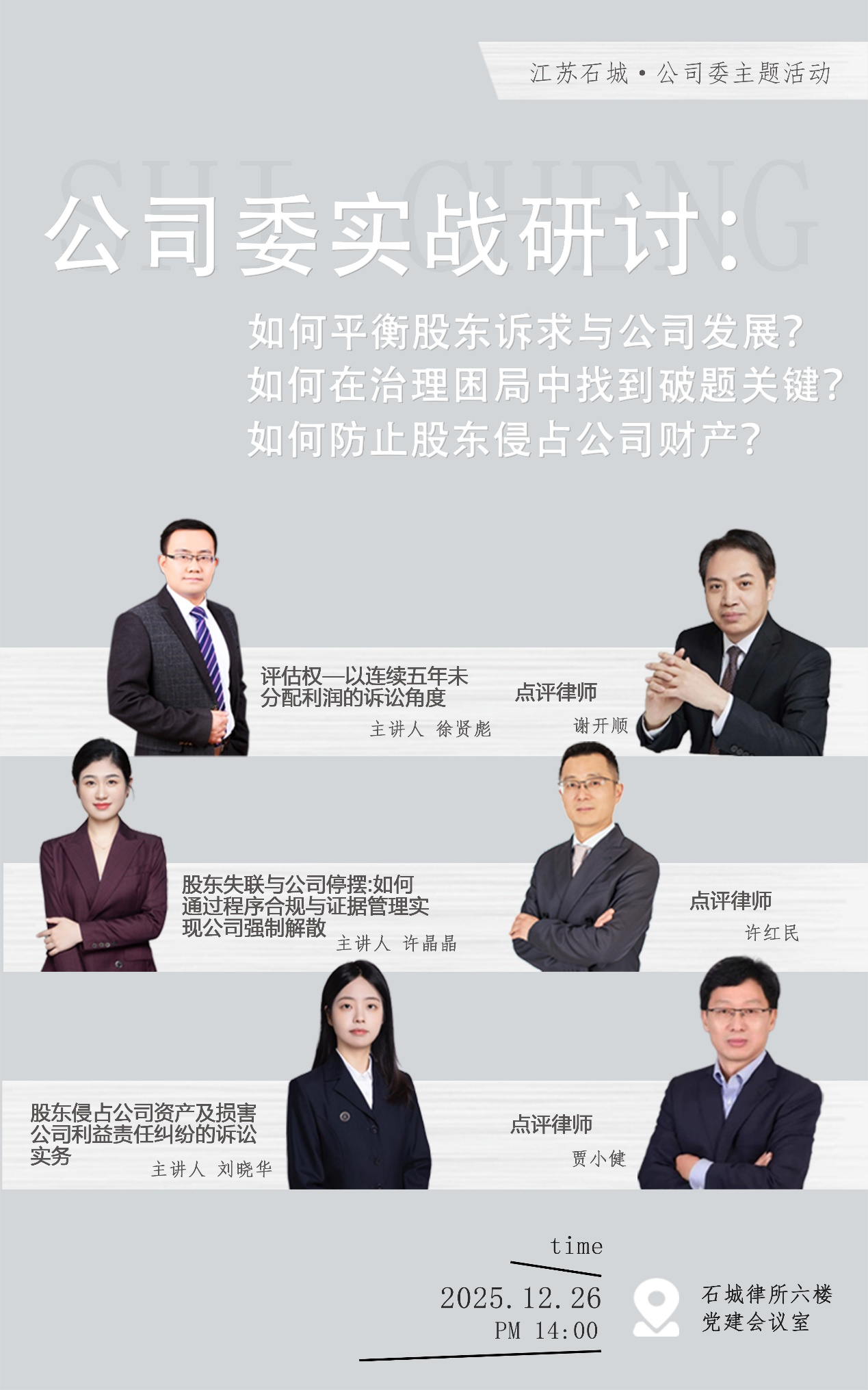 江苏石城律师事务所公司专业委员会“案例分享赋新能、学思践悟共成长”实战研讨会于2025年12月26日下午成功举办。本次研讨会聚焦股东与公司治理中的核心矛盾与实务难题,邀请徐贤彪、许晶晶、刘晓华三位律师担任主讲人,分别围绕“股东评估权行使与公司利润分配困境”、“股东失联情境下的公司强制解散路径”以及“股东侵害公司利益纠纷的诉讼应对”三大议题展开深度解析。