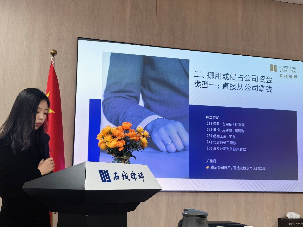 重点剖析了“挪用侵占资金”与“关联交易”两大高发场景。针对资金侵占,她区分了“直接拿钱”与“通过关联方套取”两种路径,通过多个典型案例(如(2024)京02民终7192号)揭示了法院“轻形式、重实质”的裁判思路,并强调举证关键在于构建“制度+审计”的证据组合。在关联交易部分,聚焦于“签订虚假合同套取资产”与“高价采购拿回扣”两类行为,指出审查核心在于交易真实性、价格公允性及程序合规性。